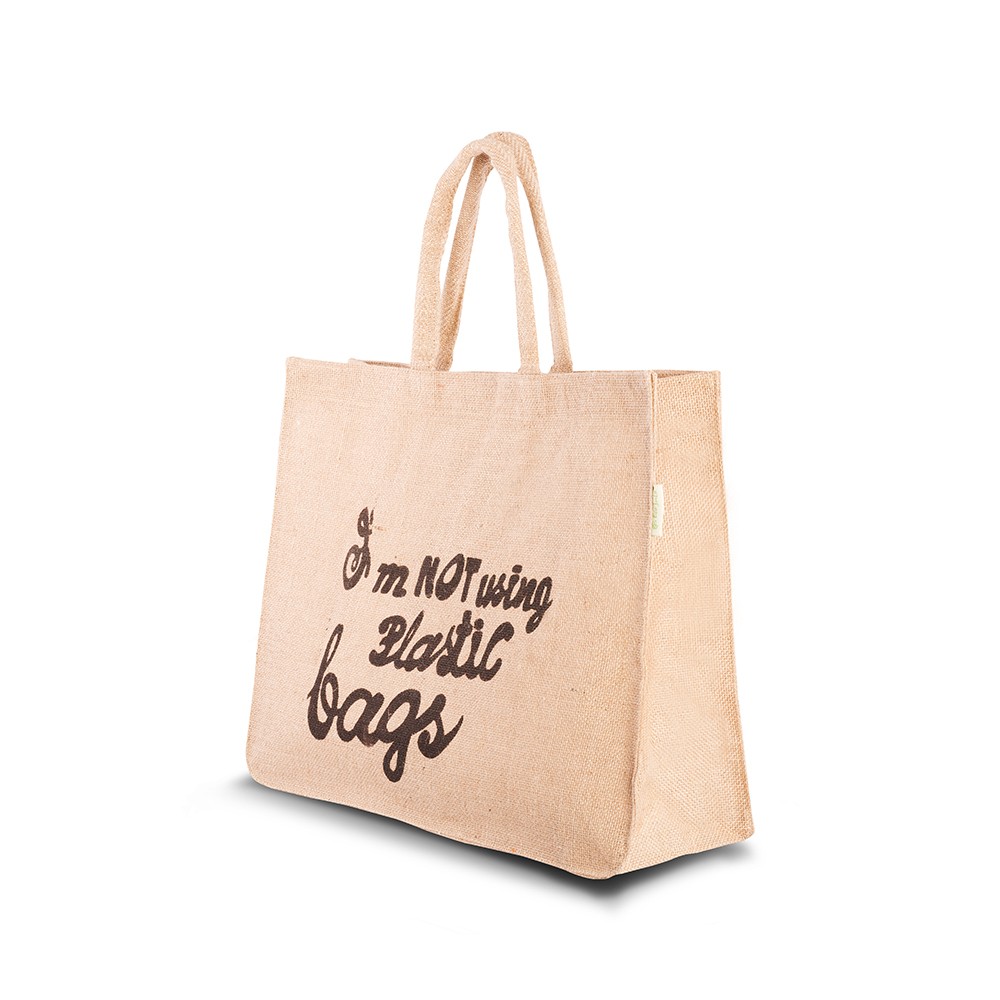 Jute draagtas met slogan op één zijde bedrukt, binnenzijde zakje en klittenband sluiting. De draagtas is voorzien van 2 gewatteerde jute handgrepen.