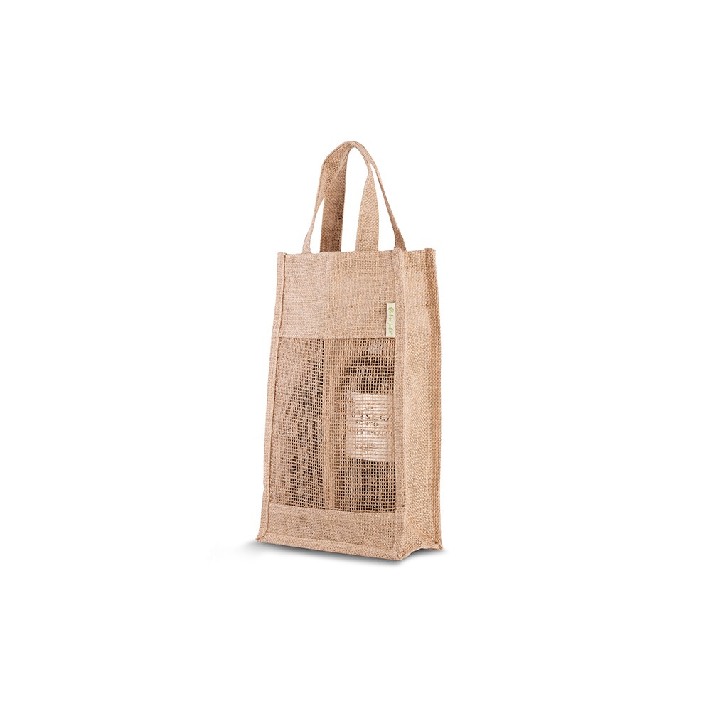 Jute wijntas, voorzien van 2 jute handgrepen. Geschikt voor 2 flessen.