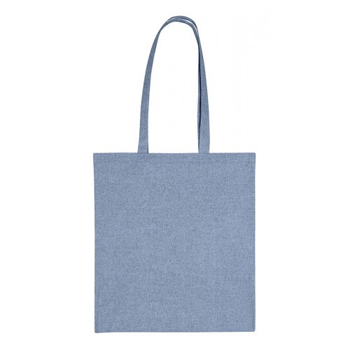 Katoenen draagtas gemaakt van 140 grams blauw gerecycled katoen. De draagtas is voorzien van 2 schouderhengsels die zijn aangestikt aan de binnenzijde van de draagtas.