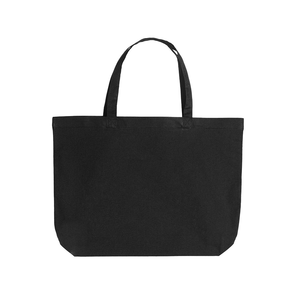 Katoenen draagtas gemaakt van 155 grams zwart katoen. De draagtas is voorzien van een bodem van 10 cm en 2 korte handgrepen die zijn aangestikt aan de binnenzijde van de draagtas.