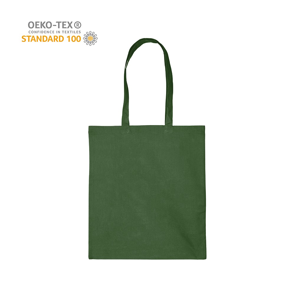 Katoenen draagtas gemaakt van 140 grams donkergroen katoen, Oeko-tex 100 gecertificeerd. De draagtas is voorzien van 2 schouderhengsels die zijn aangestikt aan de binnenzijde van de draagtas.