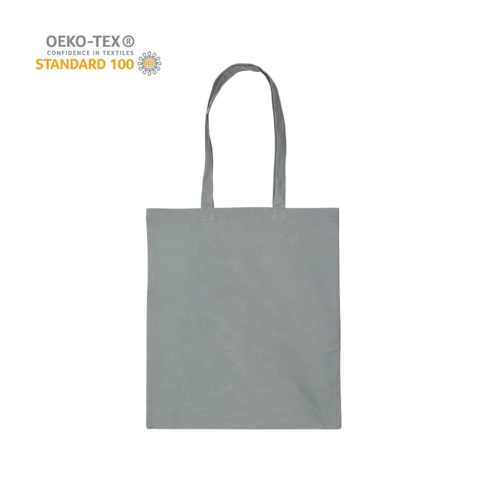 Katoenen draagtas gemaakt van 140 grams grijs katoen, Oeko-tex 100 gecertificeerd. De draagtas is voorzien van 2 schouderhengsels die zijn aangestikt aan de binnenzijde van de draagtas.