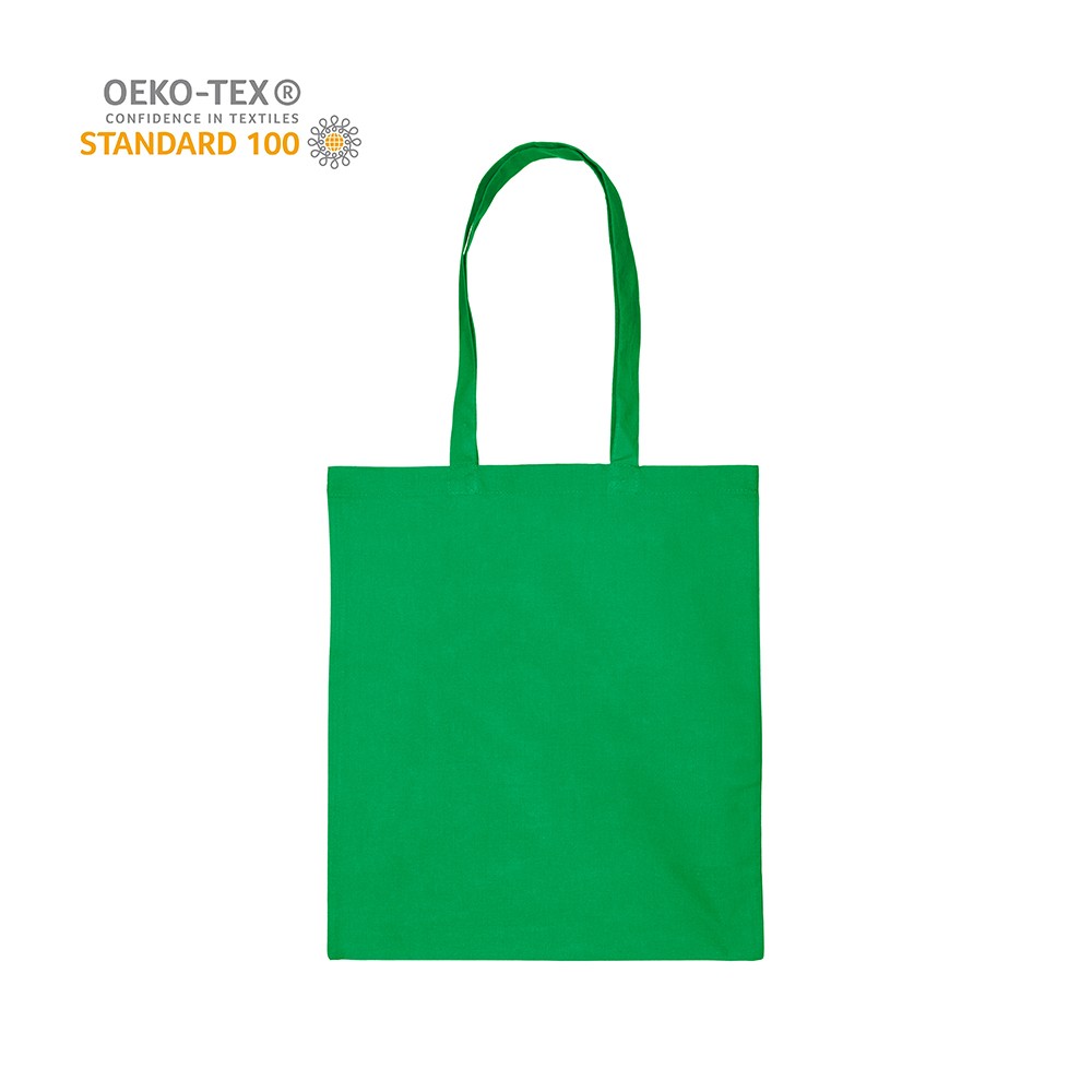 Katoenen draagtas gemaakt van 140 grams groen katoen, Oeko-tex 100 gecertificeerd. De draagtas is voorzien van 2 schouderhengsels die zijn aangestikt aan de binnenzijde van de draagtas.