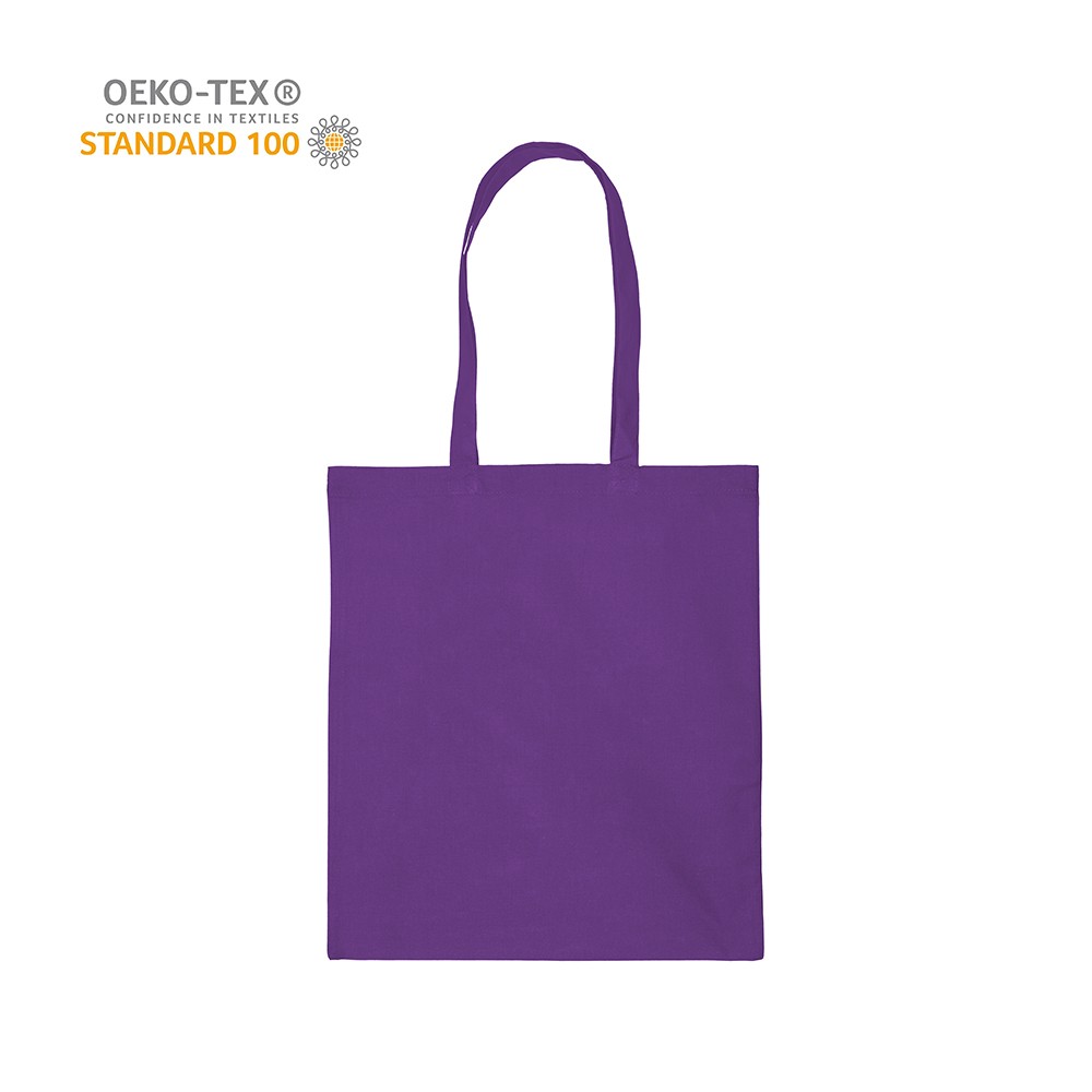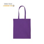 Katoenen draagtas gemaakt van 140 grams paars katoen, Oeko-tex 100 gecertificeerd. De draagtas is voorzien van 2 schouderhengsels die zijn aangestikt aan de binnenzijde van de draagtas.