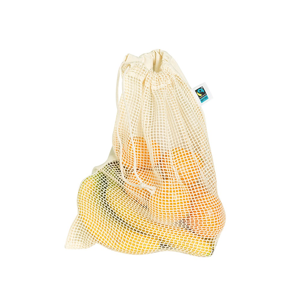 Katoenen groente en fruittas net gemaakt van 115 grams Fair Trade 100% organic. De fruittas is voorzien van een trekkoorden voor het sluiten van de tas.