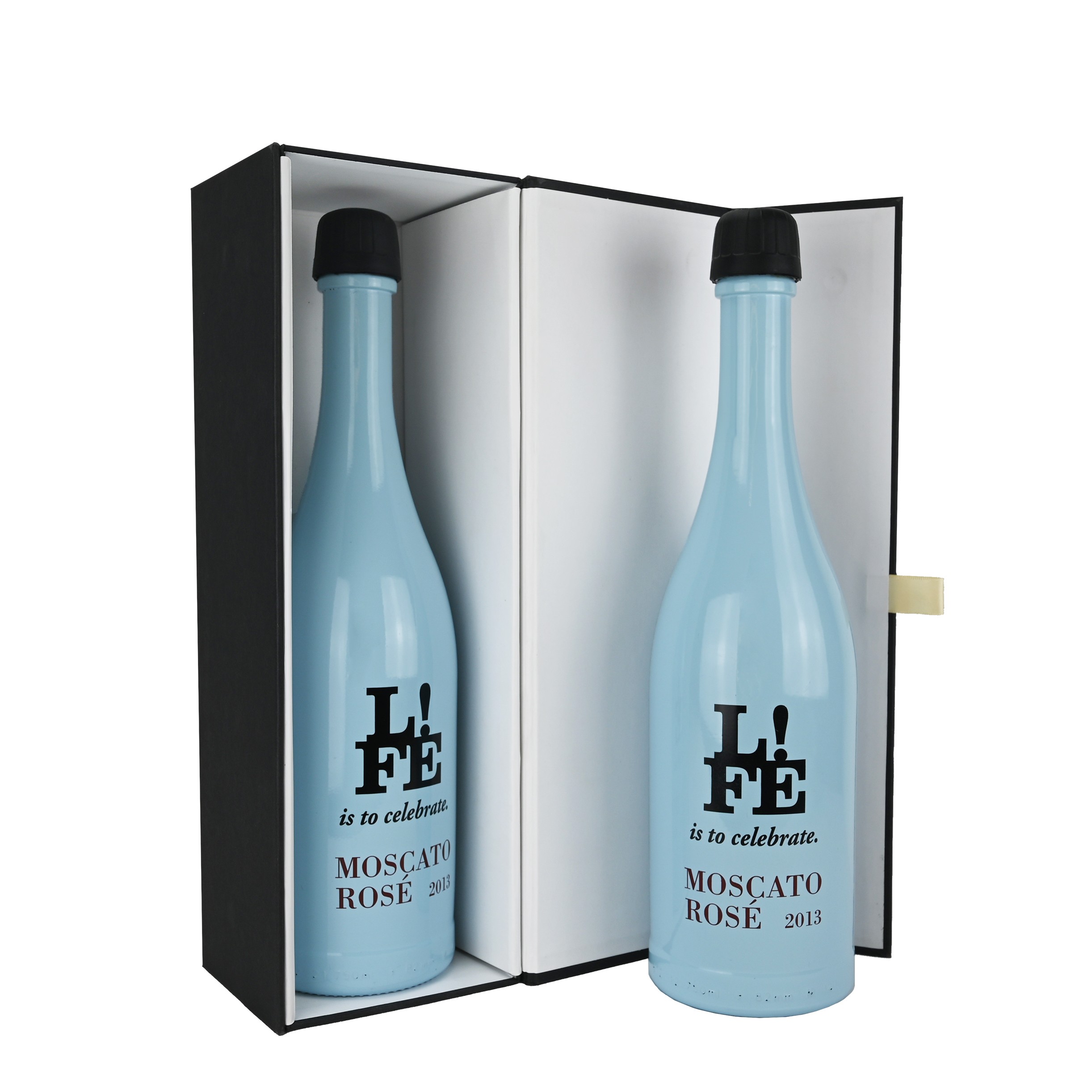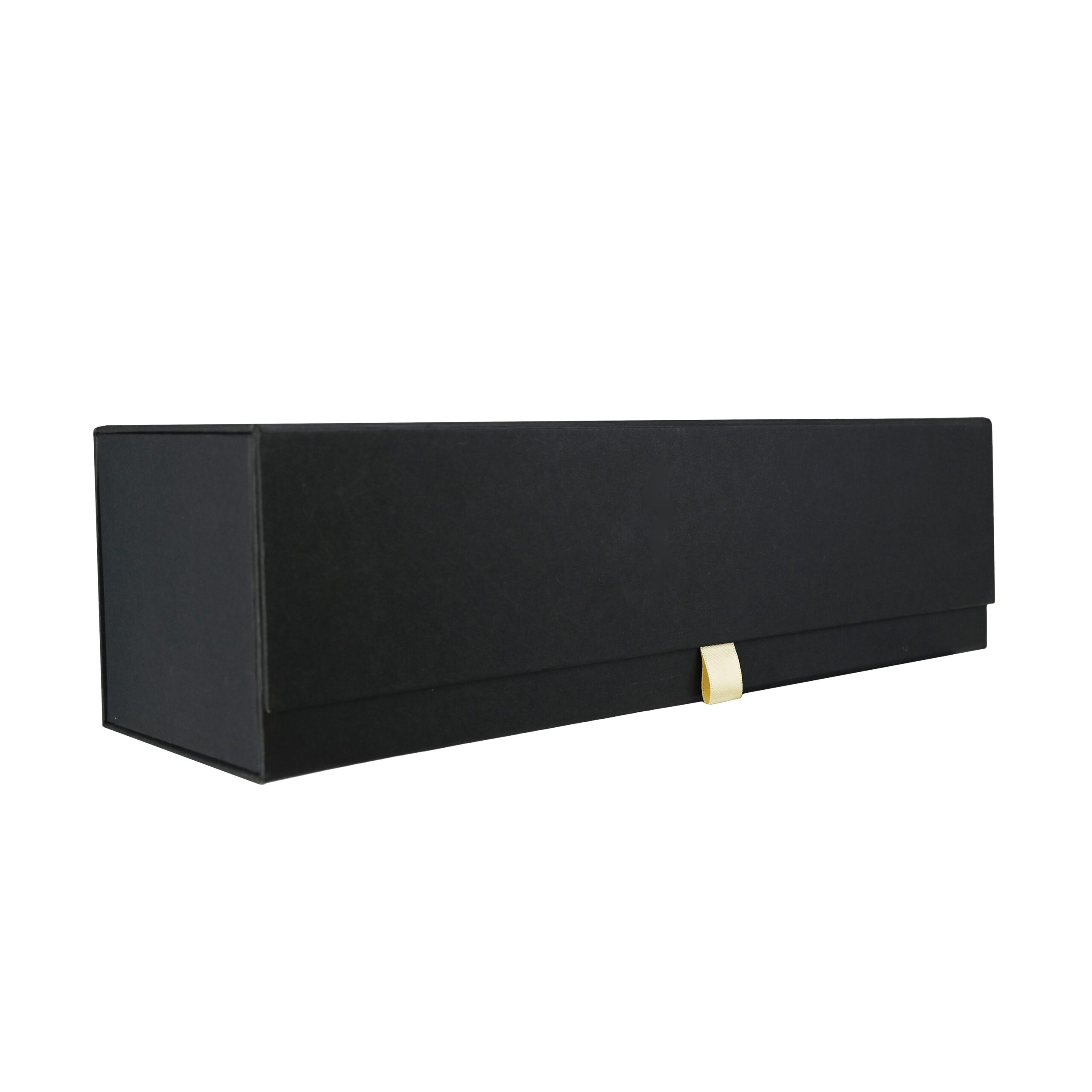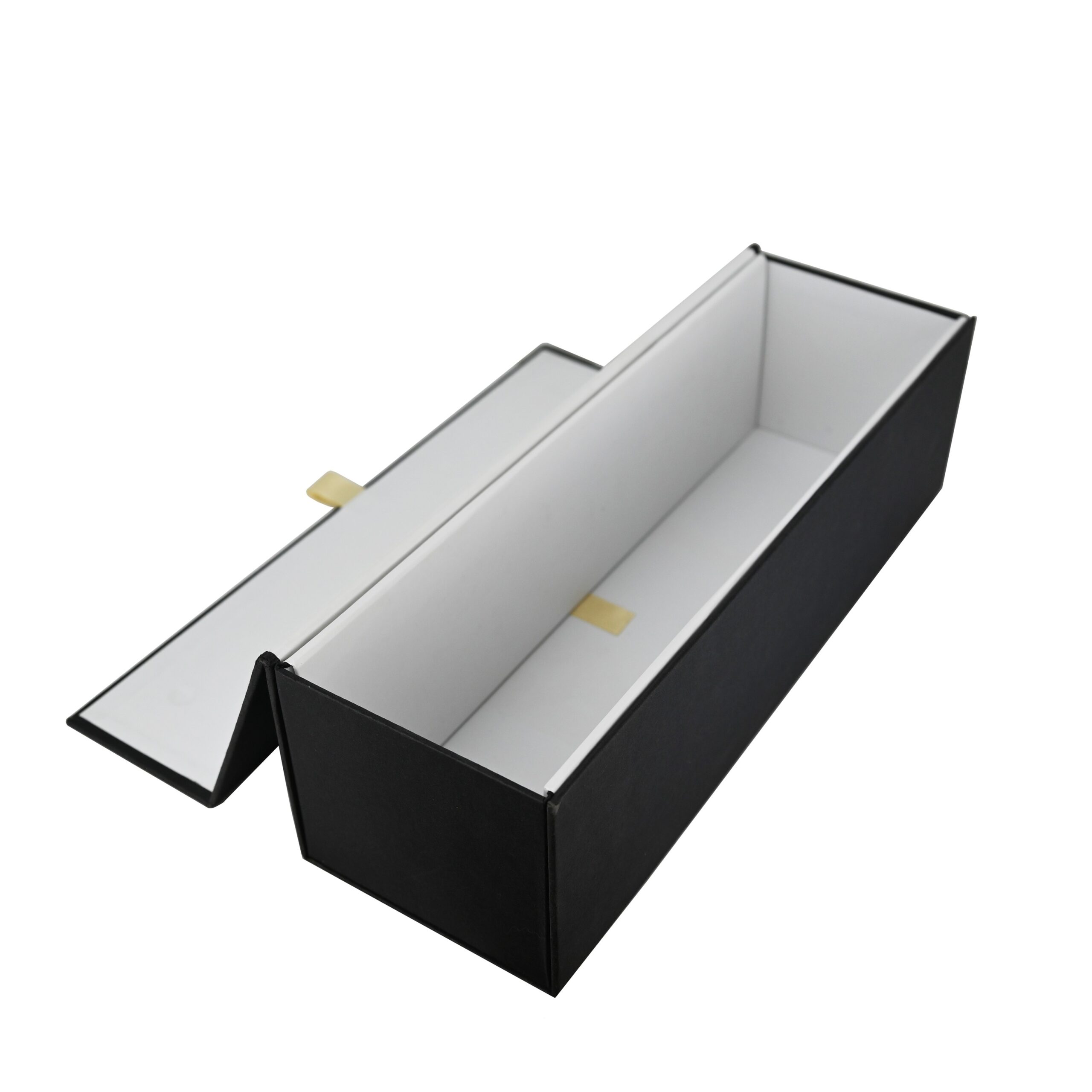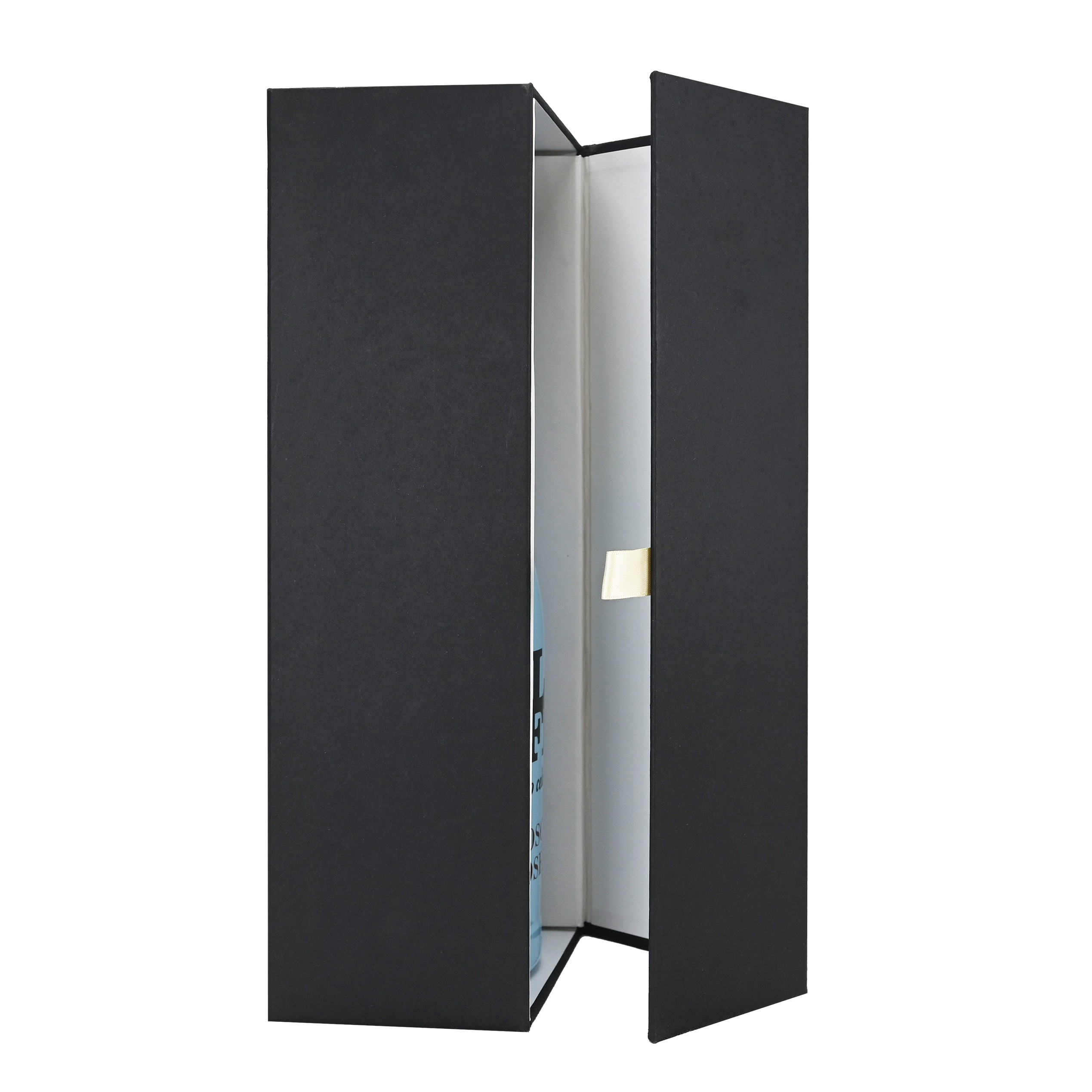 Luxe fles magneetdoos gemaakt van stevig 1500 g/m² mat gelamineerd zwart karton aan de buitenkant en mat wit aan de binnenkant. De luxe fles magneetdoos is zeer gemakkelijk te monteren dankzij de magnetische afsluitdeksel met een kleine lint  en de binnenflappen die vast worden zetten met klittenband. De luxe fles magneetdoos wordt plano en dus ruimtebesparend geleverd.