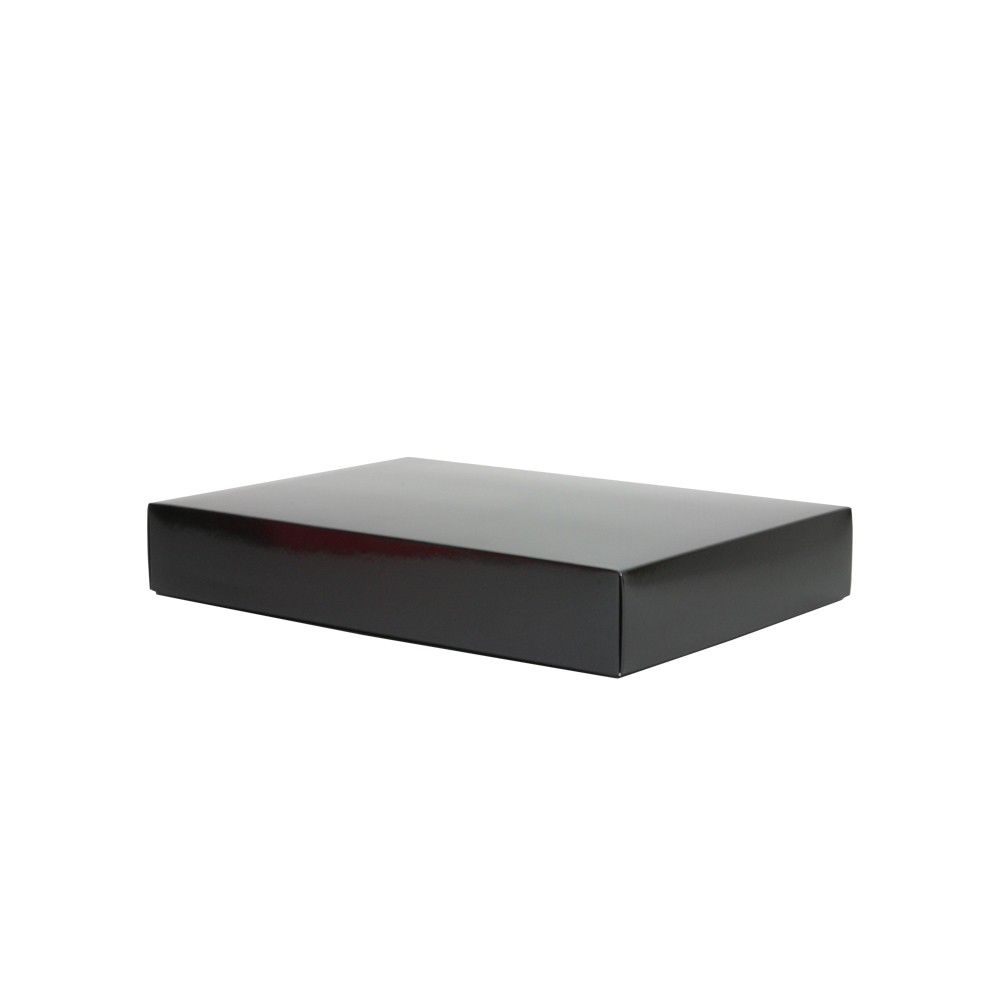 Luxe tweedelige geschenkdoos gemaakt van 500 g/m² zwart glans gelamineerd karton. De luxe geschenkdoos wordt plano (ruimtebesparend) in 2 delen geleverd en is eenvoudig te assembleren.
