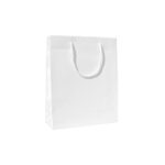 Luxe glans gelamineerde papieren draagtas met omgeslagen bovenrand, gemaakt van 160 grams wit gecoated papier. De draagtas is voorzien van 2 witte katoenen koorden die zijn vastgeknoopt aan de binnenzijde van de draagtas.