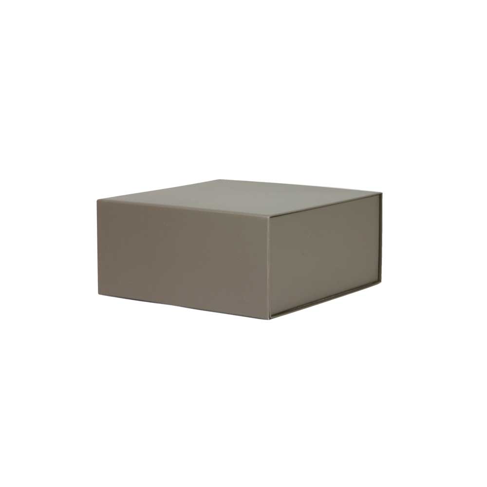 Luxe magneetdoos met automatische montage en magnetische klepsluiting, gemaakt van stevig 1200 g/m² mat gelamineerd taupe kleurig bedrukt karton. De luxe magneetdoos is voorzien van zelfklevende strips die zorgen voor een permanente montage. De luxe magneetdoos wordt plano en dus ruimtebesparend geleverd.