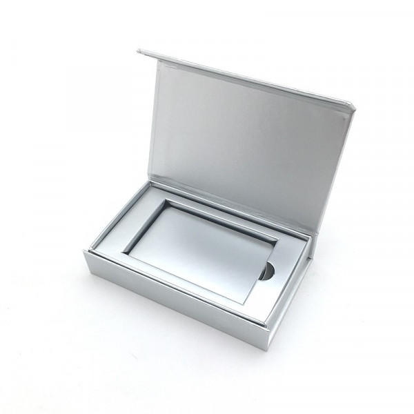 De luxe magneetdoos, 12x2x7 cm – zilver glans – voor kadobon, klantenkaart of creditcard, met inlay, heeft een sluitende magnetische klep en is gemaakt van hard karton van 1200g/m² en bevat een kartonnen steunstuk.