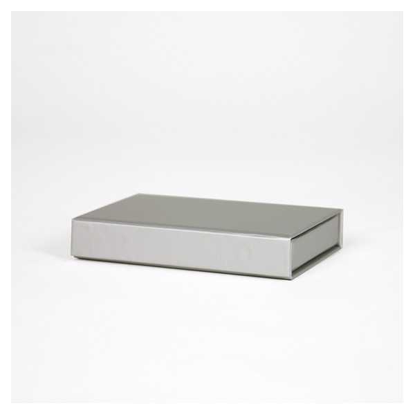 De luxe magneetdoos, 12x2x7 cm – zilver mat – voor kadobon, klantenkaart of creditcard, met inlay, heeft een sluitende magnetische klep en is gemaakt van hard karton van 1200g/m² en bevat een kartonnen steunstuk.