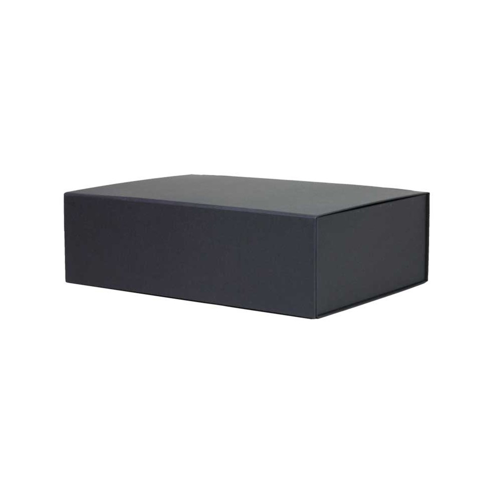 Luxe magneetdoos met automatische montage en magnetische klepsluiting, gemaakt van stevig karton van 1200 g/m², aan de binnen- en buitenkant bedekt met 120 g/m² zwart geverfd kraftpapier, voor een totaal van 1440 g/m². De luxe magneetdoos is voorzien van zelfklevende strips die zorgen voor een permanente montage. De luxe magneetdoos wordt plano en dus ruimtebesparend geleverd.