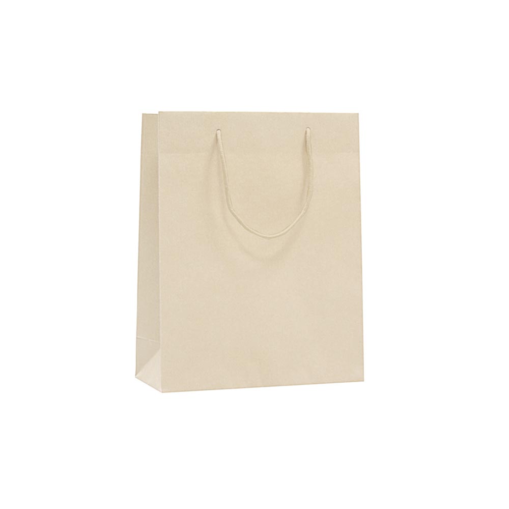 Crème bedrukte luxe papieren draagtas met omgeslagen bovenrand, gemaakt van 170 grams bruin gerecycled papier. De draagtas is voorzien van 2 crème kleurige katoenen koorden die zijn vastgeknoopt aan de binnenzijde van de draagtas. De binnenzijde van de tas is bruin.