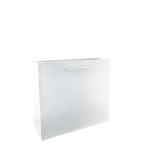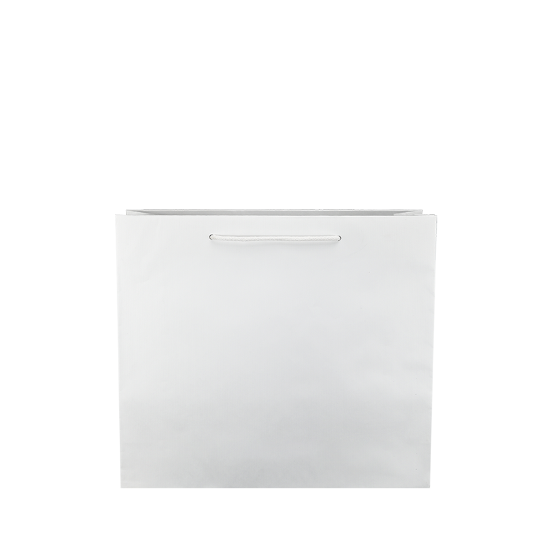 Luxe papieren draagtas met omgeslagen bovenrand, gemaakt van 120 grams wit gestreept papier. De draagtas is voorzien van 2 witte katoenen koorden die zijn vastgeknoopt aan de binnenzijde van de draagtas.