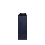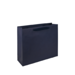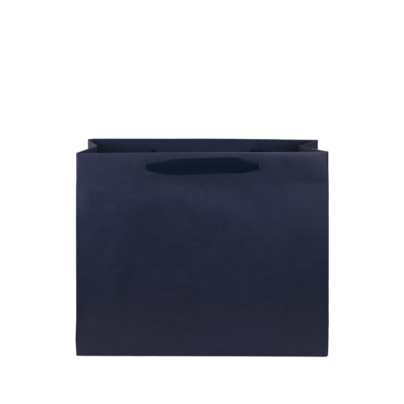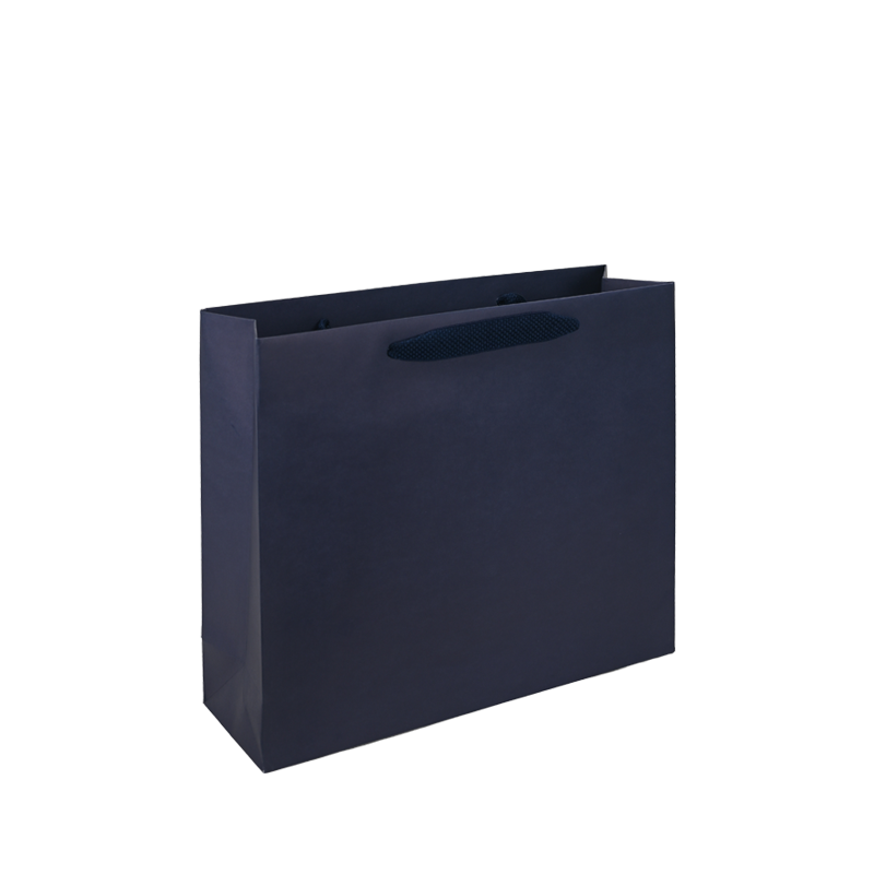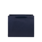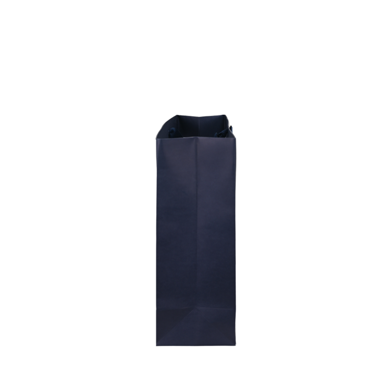 Donkerblauw bedrukte luxe papieren draagtas met omgeslagen bovenrand, gemaakt van 170 grams wit kraft papier. De draagtas is voorzien van 2 donkerblauwe katoenen linten die zijn vastgeknoopt aan de binnenzijde van de draagtas. De binnenzijde van de tas is wit.