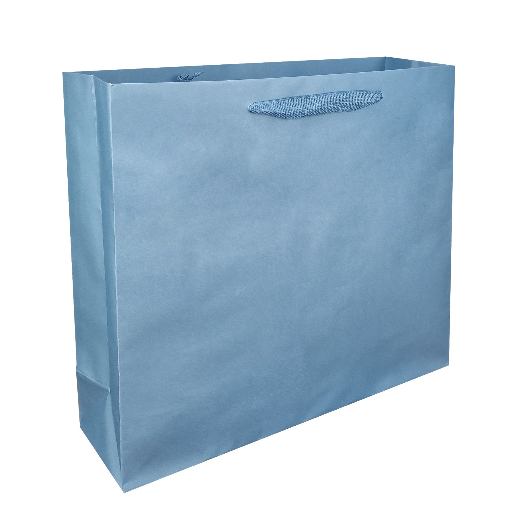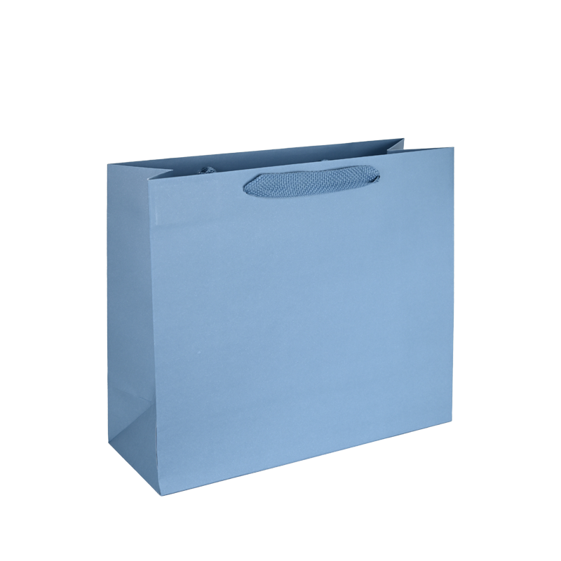 Jeans blauw bedrukte luxe papieren draagtas met omgeslagen bovenrand, gemaakt van 170 grams wit kraft papier. De draagtas is voorzien van 2 jeans blauw kleurige katoenen linten die zijn vastgeknoopt aan de binnenzijde van de draagtas. De binnenzijde van de tas is wit.