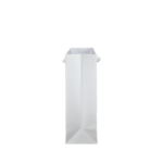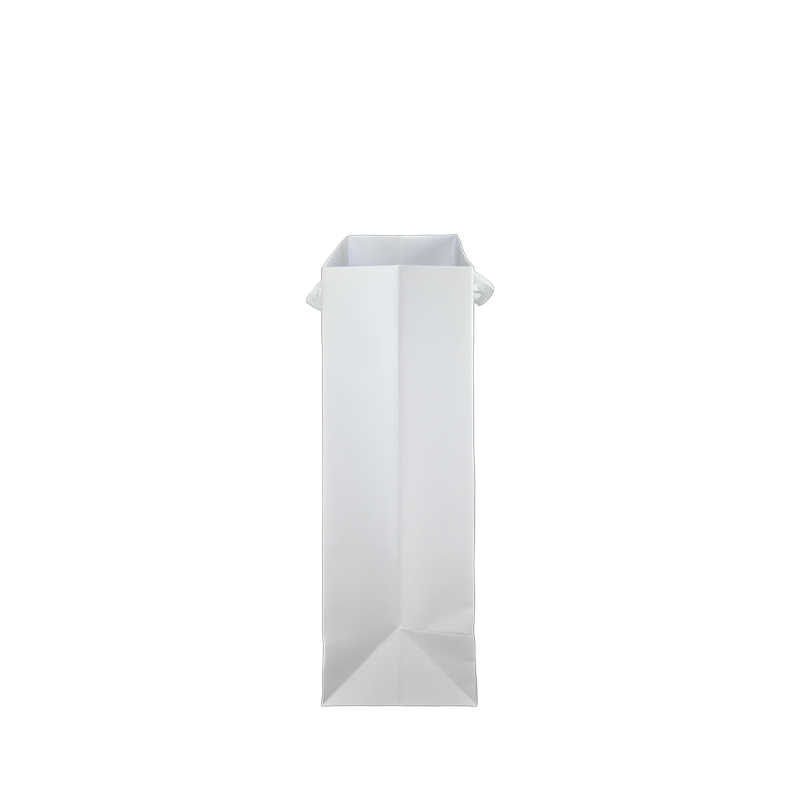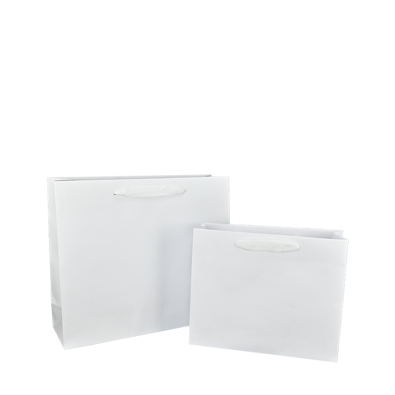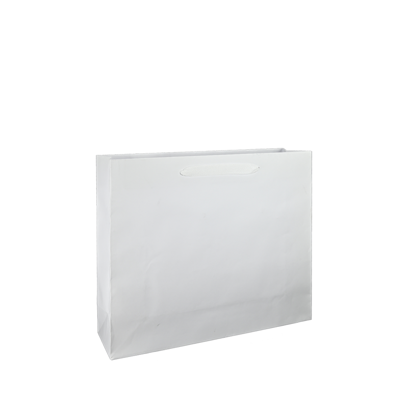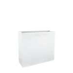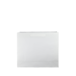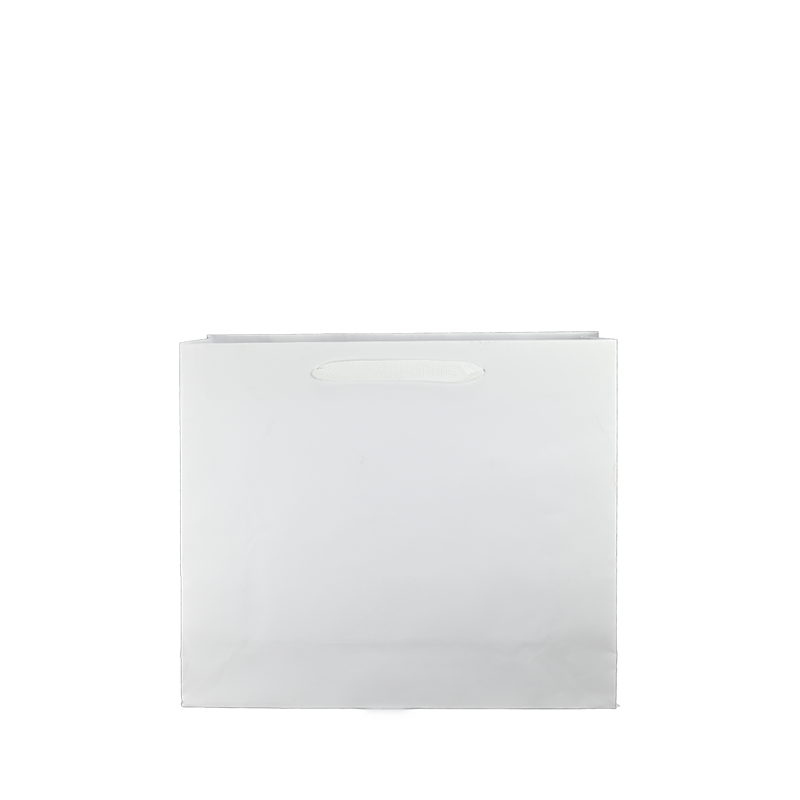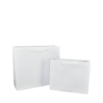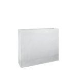 Luxe papieren draagtas met omgeslagen bovenrand, gemaakt van 170 grams wit kraft papier. De draagtas is voorzien van 2 witte katoenen linten die zijn vastgeknoopt aan de binnenzijde van de draagtas.