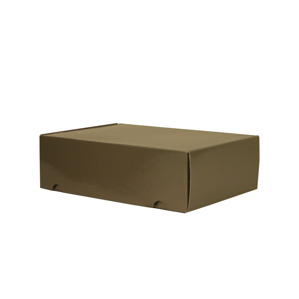 Luxe verzenddoos gemaakt van 2 mm golf karton 700 gr/m2 goud kleurig bedrukt en voorzien van een krasbestendig glans laminaat. De luxe verzenddoos wordt eendelig plat geleverd en is zeer gemakkelijk in elkaar te zetten.