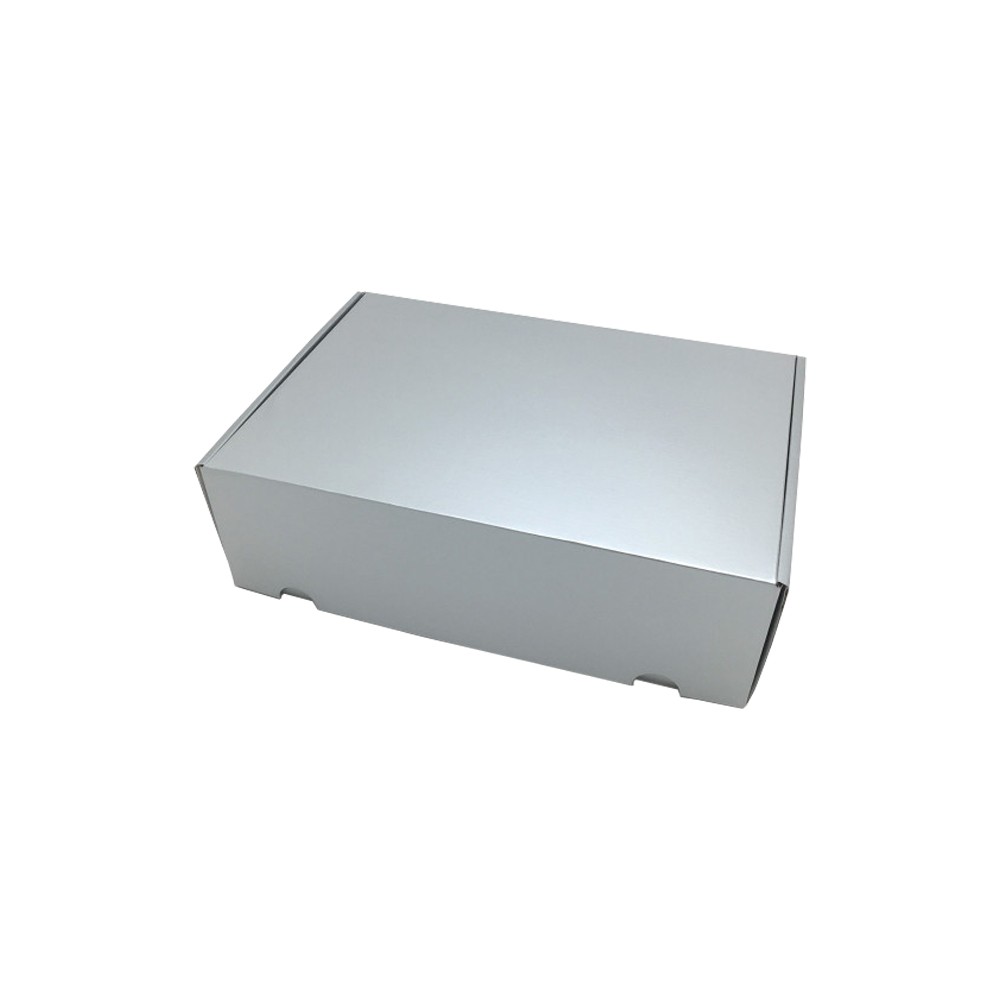 Luxe verzenddoos gemaakt van 2 mm golf karton 700 gr/m2 zilver kleurig bedrukt en voorzien van een krasbestendig glans laminaat. De luxe verzenddoos wordt eendelig plat geleverd en is zeer gemakkelijk in elkaar te zetten.