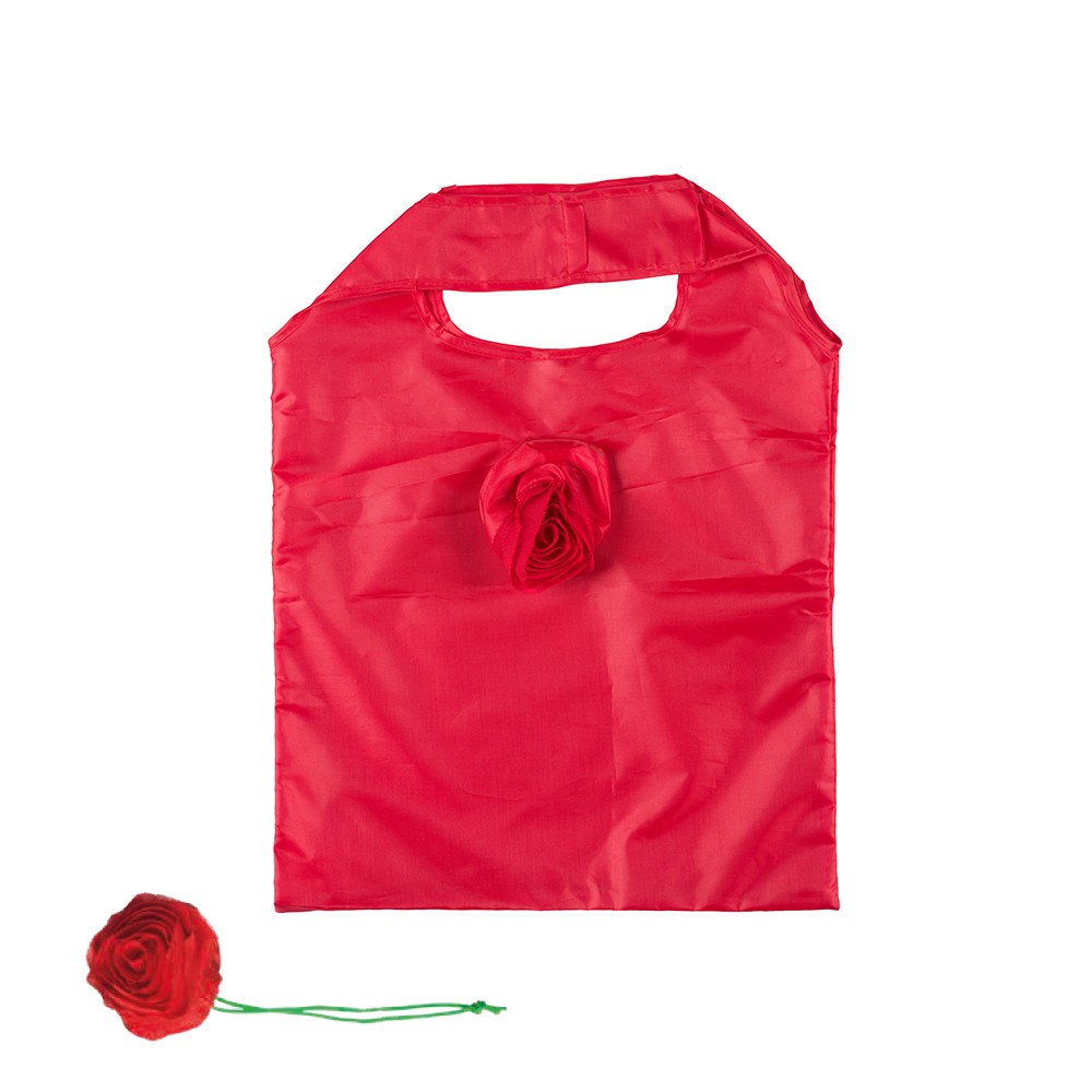 Opvouwbare polyester draagtas gemaakt van 210T rood polyester. De draagtas is voorzien van twee korte rode handgrepen en trekkoord sluiting op de tas. De tas is op te vouwen tot een opbergzakje in de vorm van een roos.