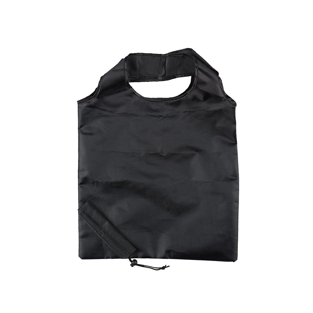 Opvouwbare polyester draagtas gemaakt van 210T zwart polyester. De draagtas is voorzien van twee korte zwarte handgrepen en trekkoord sluiting op de tas. De tas is op te vouwen tot een handig opbergzakje.