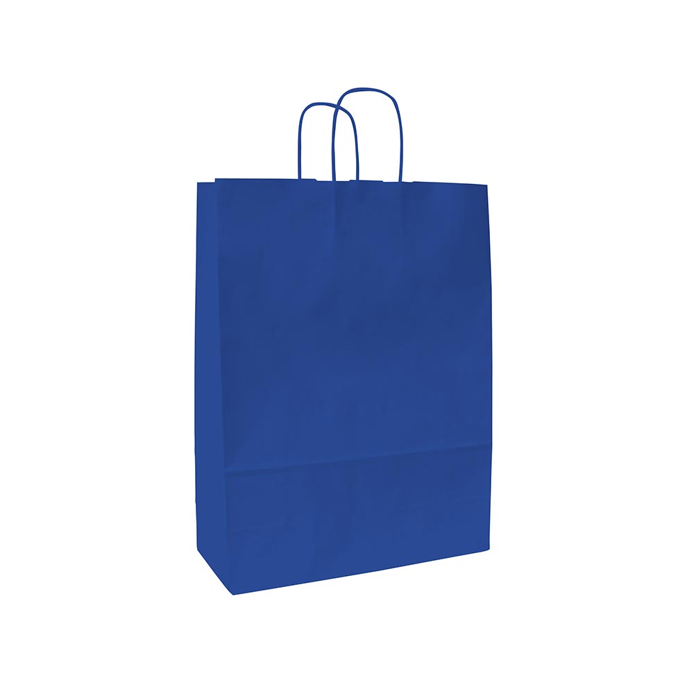 Blauw bedrukte papieren draagtas gemaakt van 100 grams wit kraft. De draagtas is voorzien van 2 blauwe gedraaide papieren handgrepen die zijn ingeplakt aan de binnenzijde van de draagtas. De binnenzijde van de tas is wit.