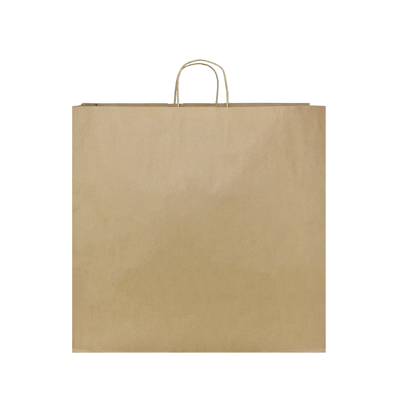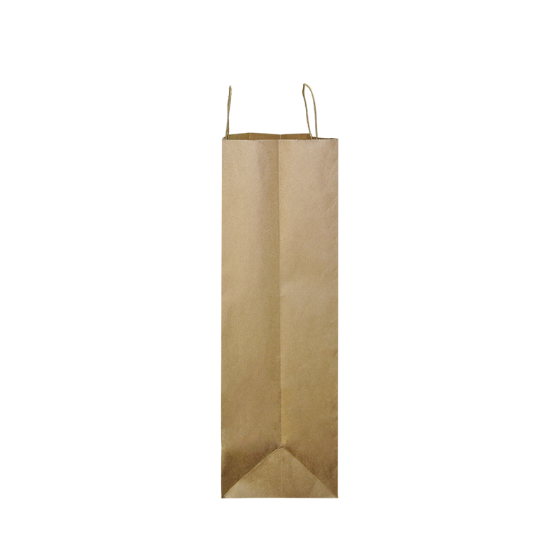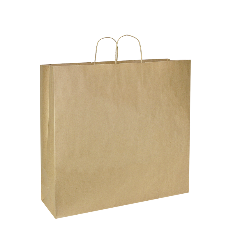 Papieren draagtas gemaakt van bruin gerecyled kraft papier. De draagtas is voorzien van 2 bruine gedraaide papieren handgrepen die zijn ingeplakt aan de binnenzijde van de draagtas.