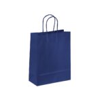 Blauw bedrukte papieren draagtas met omgeslagen bovenrand, gemaakt van 120 grams wit kraft. De draagtas is voorzien van 2 blauwe gedraaide papieren handgrepen die zijn ingeplakt aan de binnenzijde van de draagtas. De binnenzijde van de tas is wit.