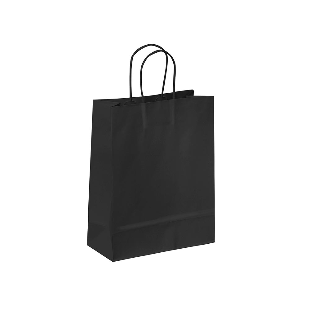 Zwart bedrukte papieren draagtas met omgeslagen bovenrand, gemaakt van 120 grams wit kraft. De draagtas is voorzien van 2 zwarte gedraaide papieren handgrepen die zijn ingeplakt aan de binnenzijde van de draagtas. De binnenzijde van de tas is wit.