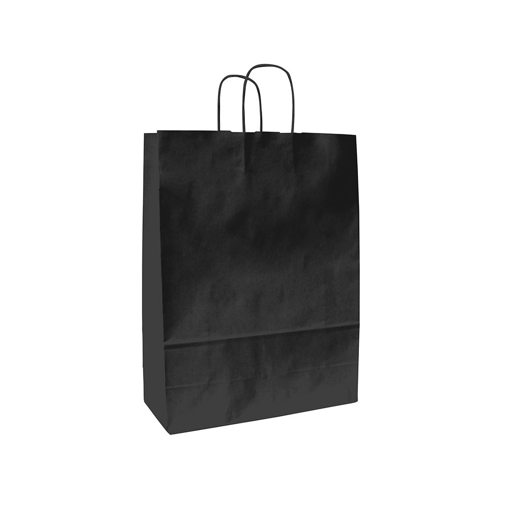 Papieren draagtas gemaakt van 100 grams zwart kraft papier. De tas is voorzien van 2 zwarte gedraaide papieren handgrepen die zijn ingeplakt aan de binnenzijde van de draagtas.