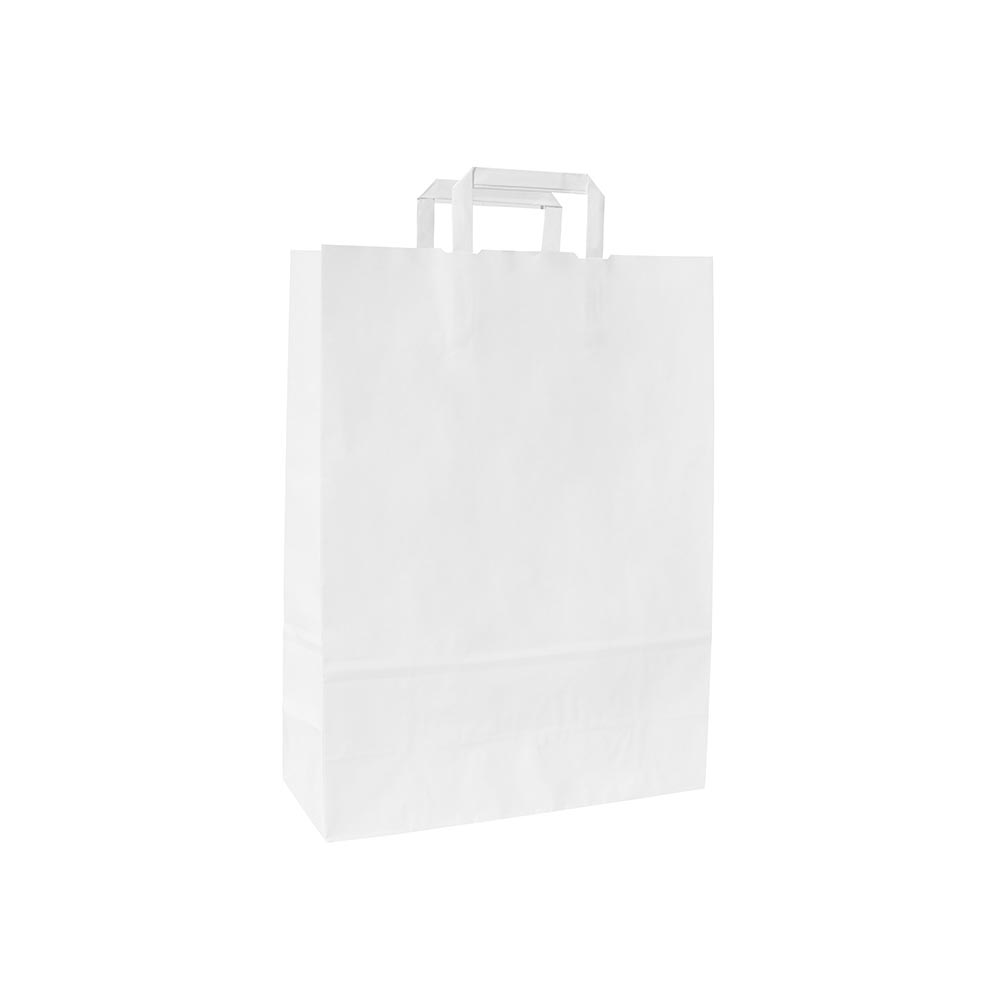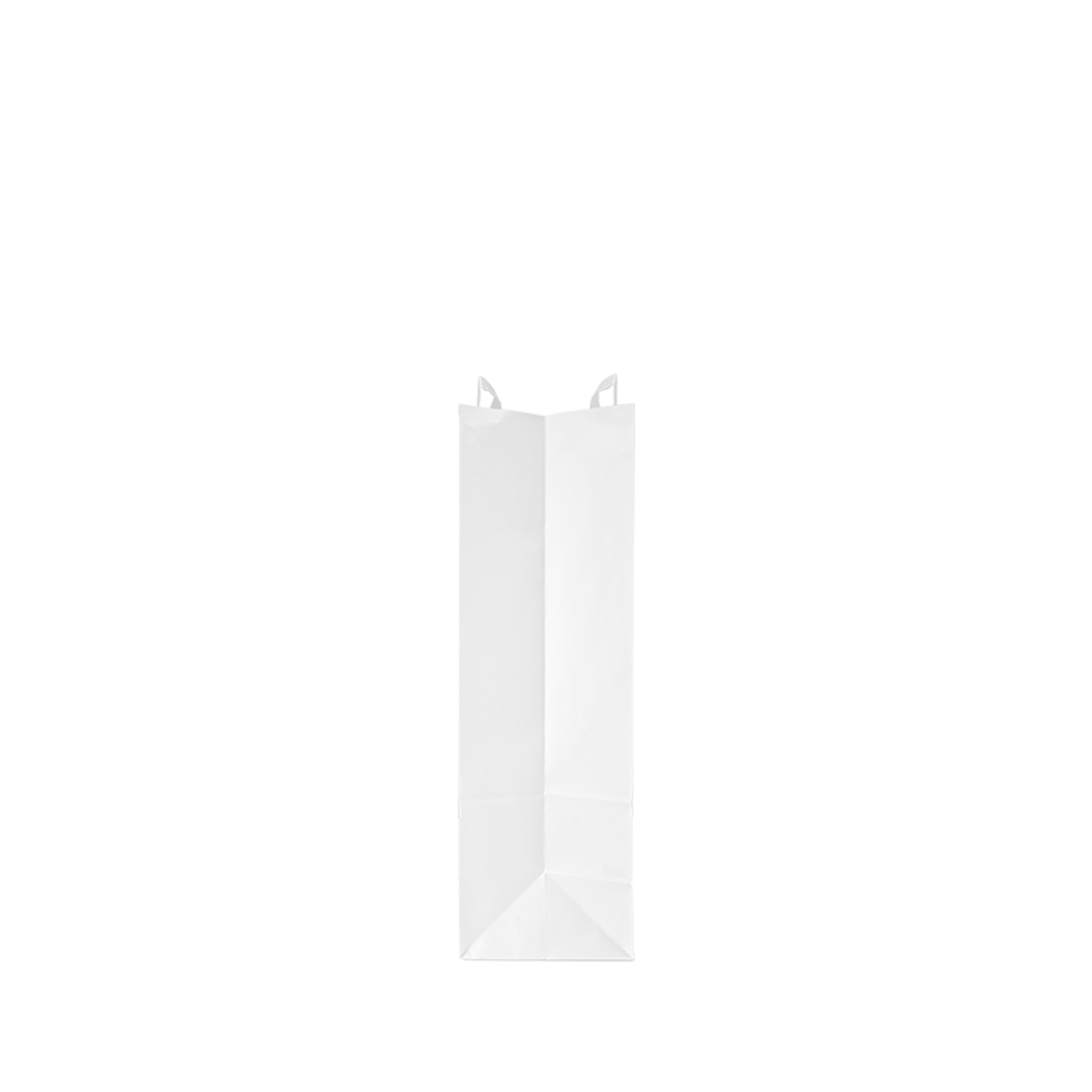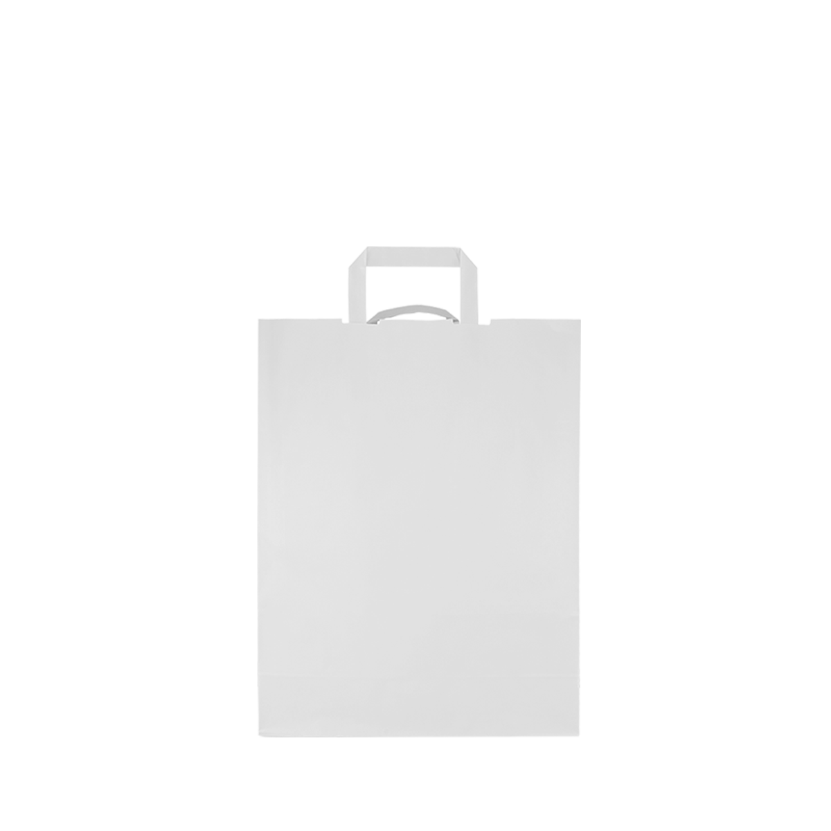 Papieren draagtas gemaakt van 80 grams wit kraft papier. De draagtas is voorzien van 2 witte platte papieren handgrepen die zijn ingeplakt aan de binnenzijde van de draagtas.