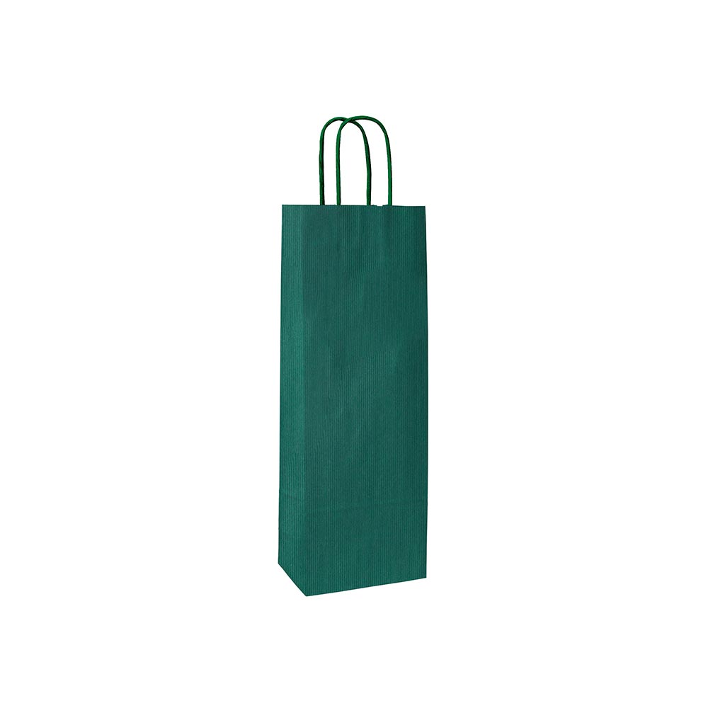 Groen bedrukte papieren wijntas gemaakt van 120 grams bruin gestreept papier. De wijntas is voorzien van 2 groene gedraaide papieren handgrepen die zijn ingeplakt aan de binnenzijde van de wijntas.